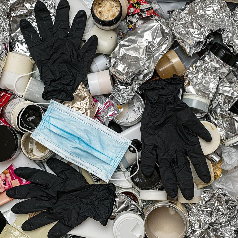Please send us mixed salon waste including metal colour tubes and hair foils, empty plastic product containers, disposable gloves, masks, and used coffee cups.