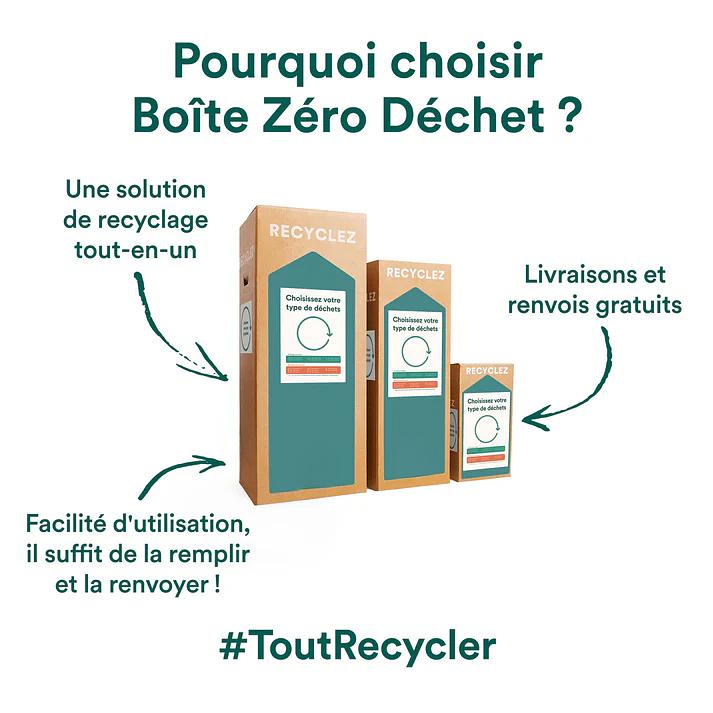 À noter : en raison des flux de déchets spécifiques acceptés, ceux-ci ne peuvent pas être inclus dans la Boîte Tout-en-un et doivent être recyclés exclusivement avec la solution Boîte Zéro Déchet – Tri Essentiel.