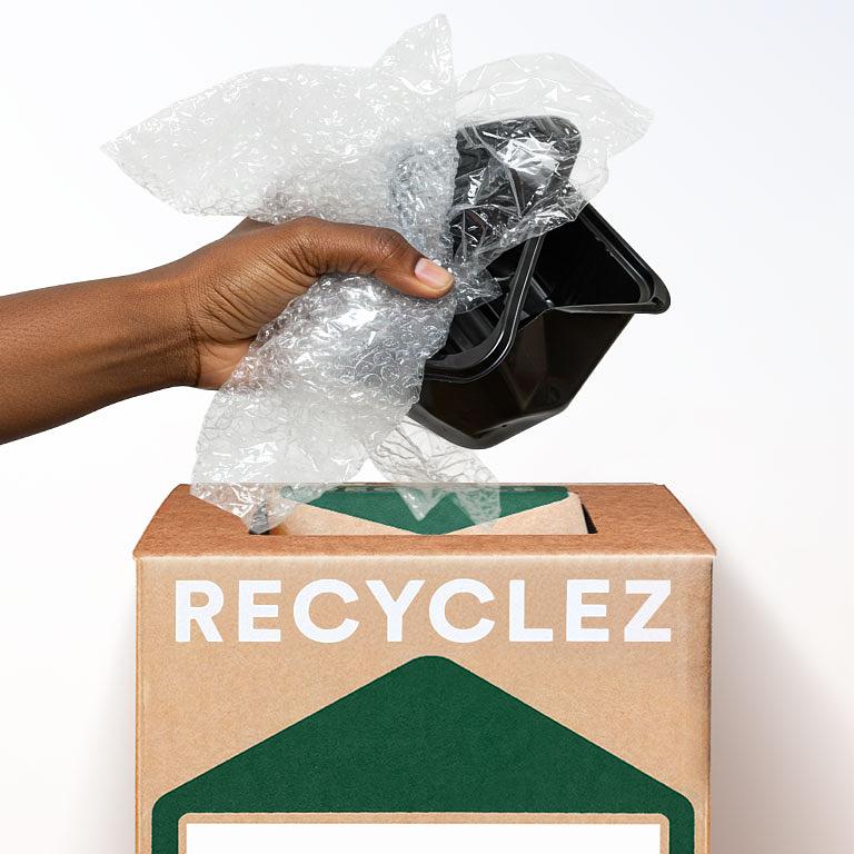 Utilisez cette Boîte Zéro Déchet pour recycler tout emballage plastique souple ou rigide. Remarque : Veuillez retirer les restes de nourriture et les déchets.