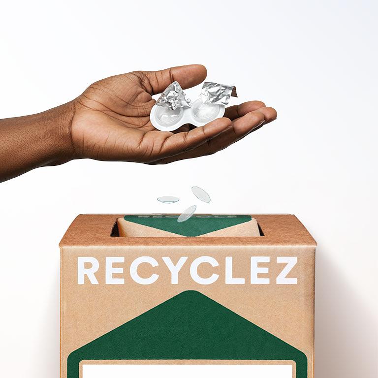 Vous pouvez utiliser cette Boîte Zéro Déchet™ pour envoyer tout type et toute marque de lentilles de contact, films plastiques, dosettes et bouteilles vides de solution.