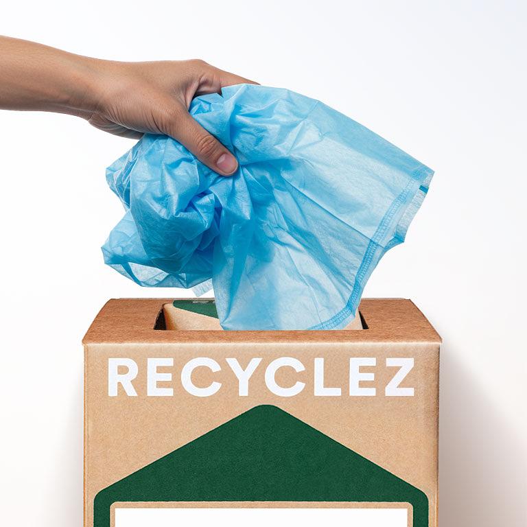 Vous pouvez utiliser cette Boîte Zéro Déchet™ pour nous envoyer tout vêtement jetable non tissé, quelle que soit la marque et la taille.
